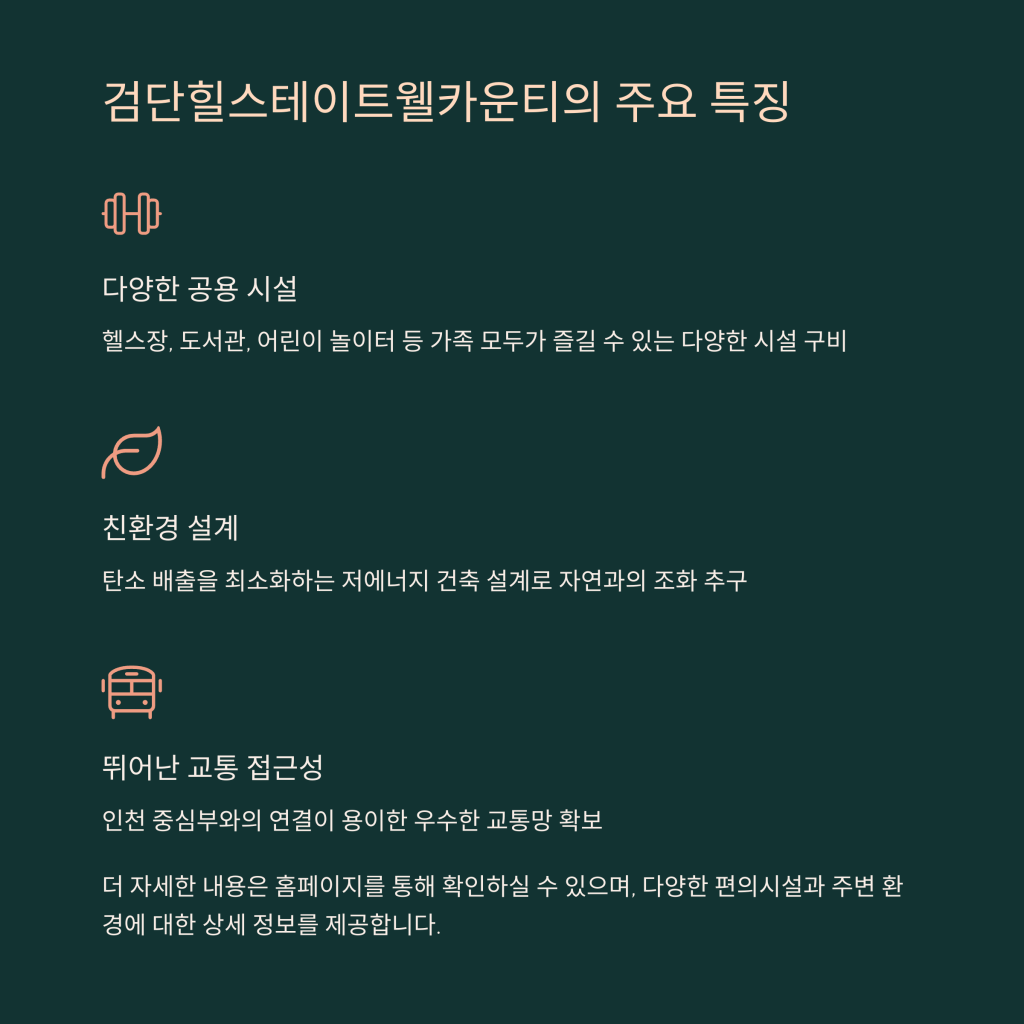검단힐스테이트웰카운티는 여러 가지 특징으로 주목받고 있습니다. 첫째, 입주민의 생활 편의를 고려한 다양한 공용 시설이 마련되어 있습니다.