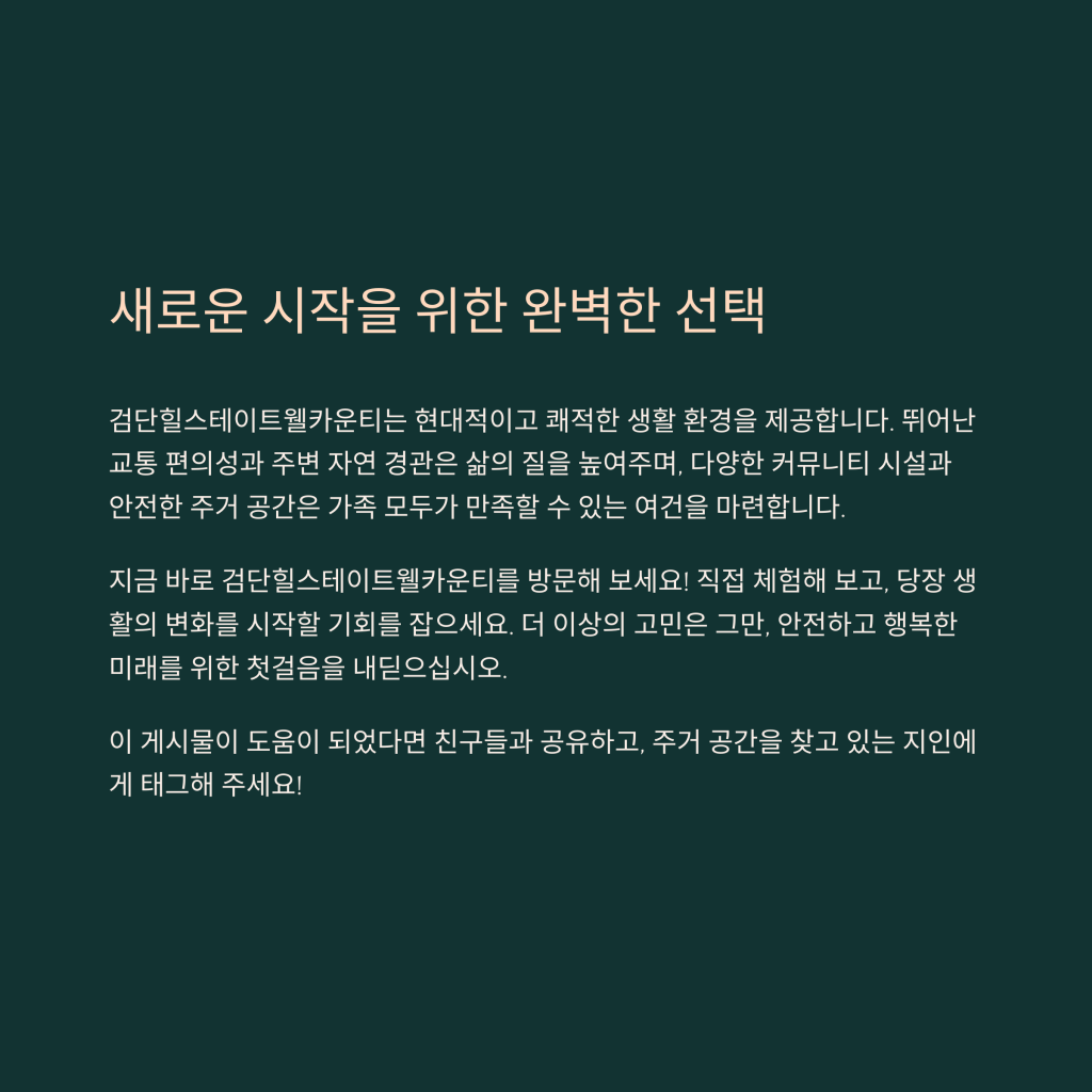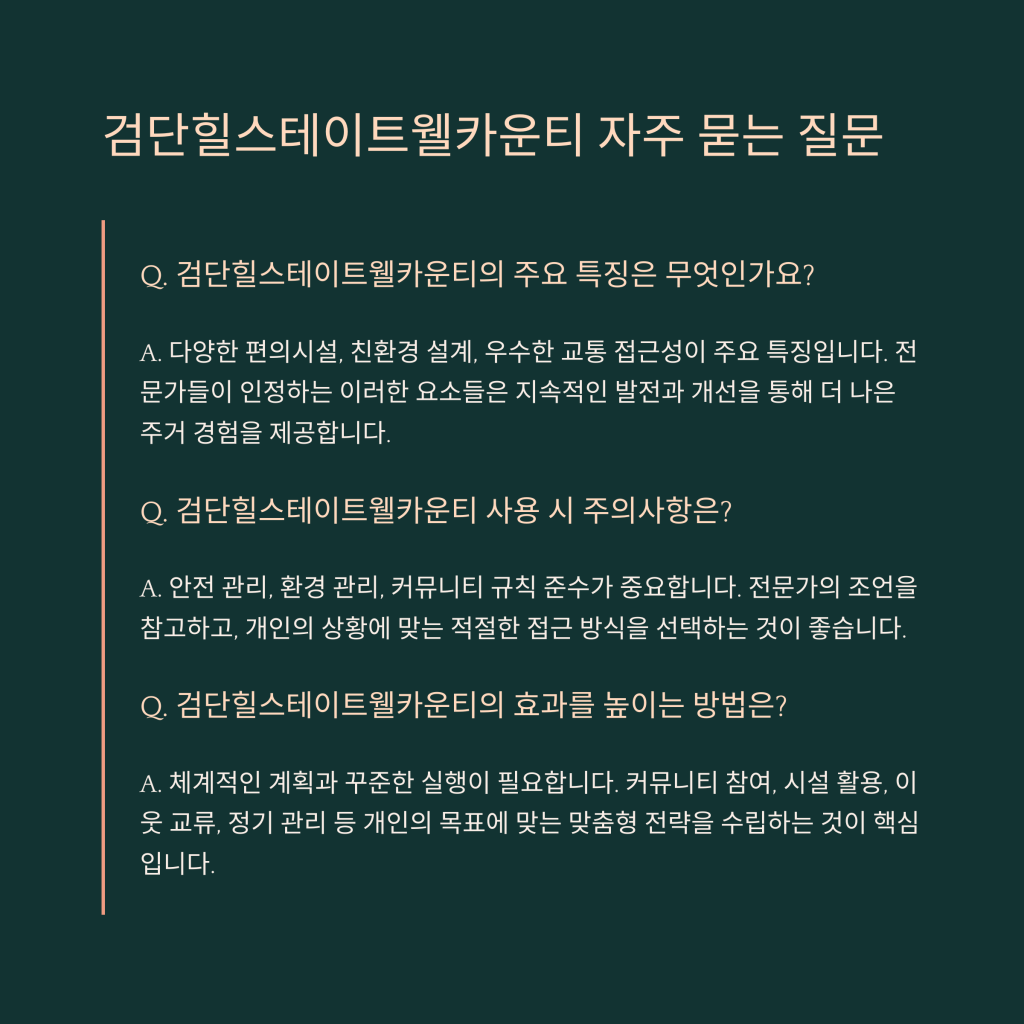 마지막으로, 정기적인 유지보수를 통해 주거 공간을 적절히 관리하는 것이 중요합니다. 이런 점들을 유념한다면, 검단힐스테이트웰카운티에서의 생활이 더욱 풍요롭고 즐거워질 것입니다.