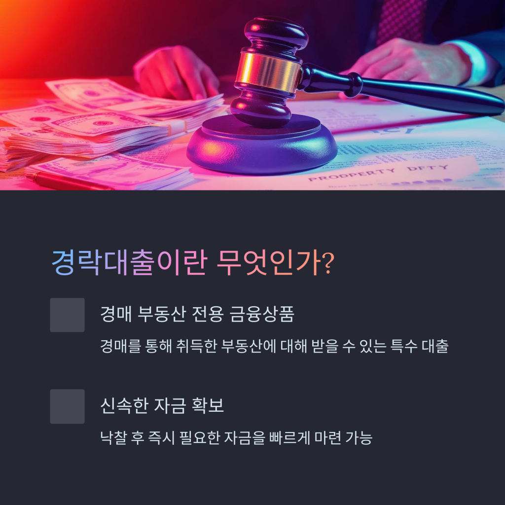 경락대출은 경매를 통해 취득한 부동산에 대해 대출을 받을 수 있는 금융 상품입니다. 이는 경매에 참여해 낙찰 받은 후, 즉시 자금이 필요할 경우에 유용합니다.