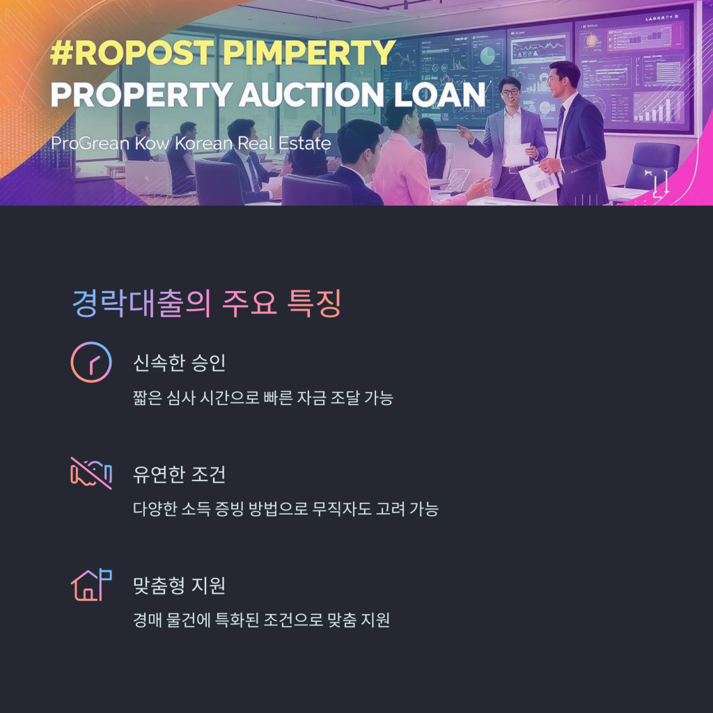 이 대출 상품을 이용하면 경매 물건을 더욱 손쉽게 구매할 수 있으며, 일반 대출보다 요청 및 승인 과정이 간편합니다.