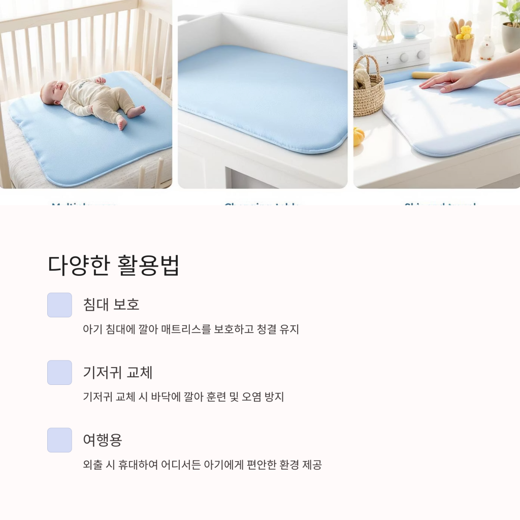 아기의 침대에 사용할 수 있으며, 기저귀 교체 시에는 바닥에 깔아 훈련할 수 있는 등 용도가 다양합니다. 또한, 여행 중에 아기가 자는 곳에도 활용 가능합니다.