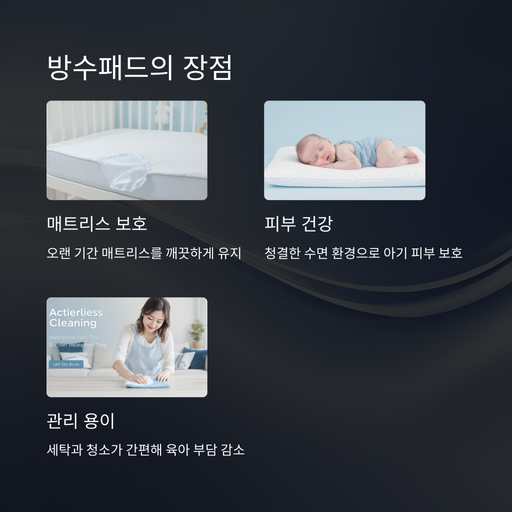 둘째, 아기의 피부와 건강을 보호하면서도 청결한 수면 환경을 조성해 줍니다. 셋째, 청소 및 관리가 용이하여 바쁜 육아 생활에 유용합니다.