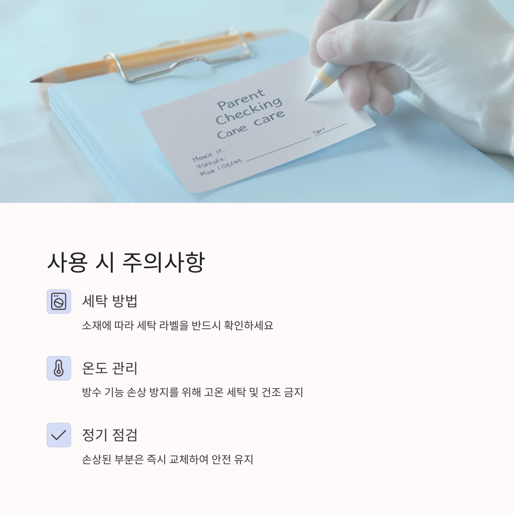 둘째, 너무 강한 세제를 사용하면 소재가 손상될 수 있으므로 주의가 필요합니다. 셋째, 사용 후 주기적으로 상태를 점검하고, 손상된 부분이 있으면 즉시 교체하는 것이 안전합니다.