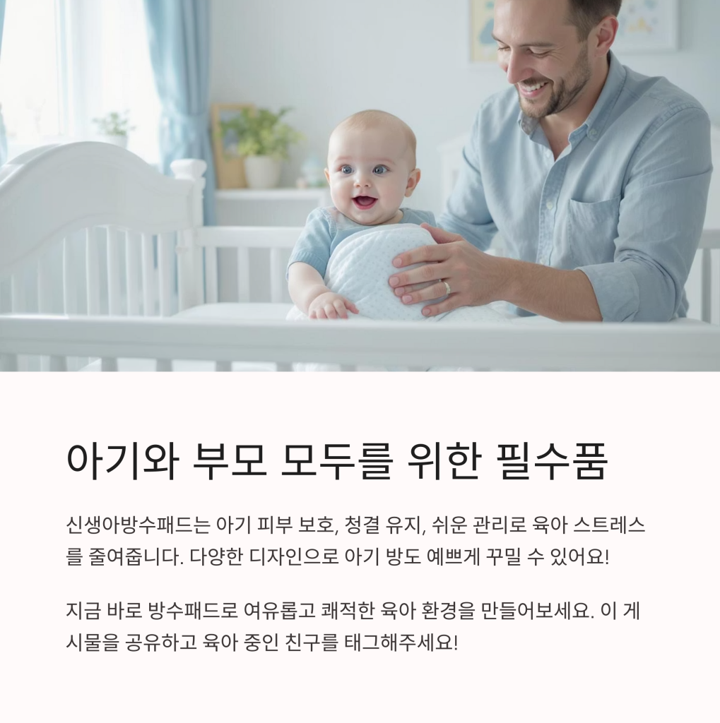 지금 바로 신생아방수패드를 선택하여 여유롭고 쾌적한 육아 환경을 만들어보세요! 아기가 편안하게 자라날 수 있도록 돕고, 부모의 스트레스를 줄이는 초석이 될 것입니다.