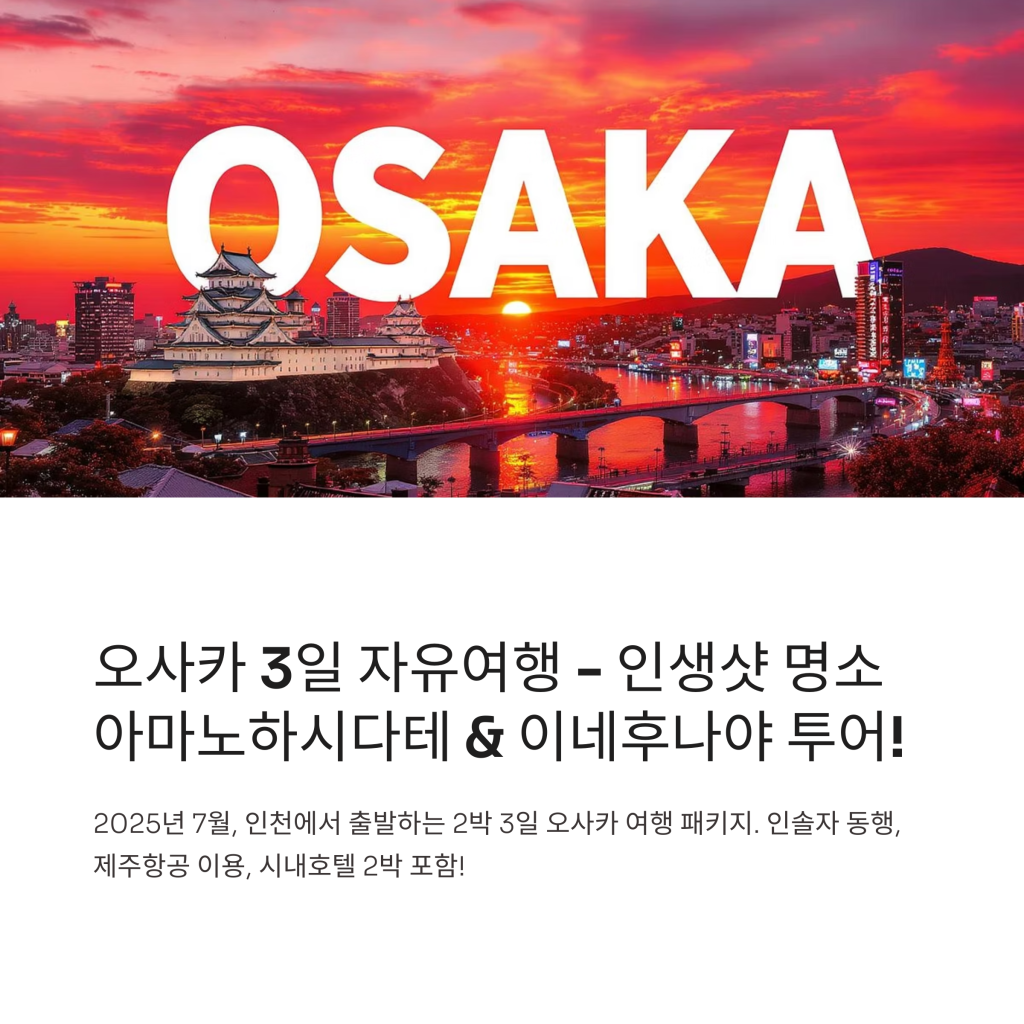 2025년 7월, 인천에서 출발하는 2박 3일 오사카 여행 패키지. 인솔자 동행, 제주항공 이용, 시내호텔 2박 포함!