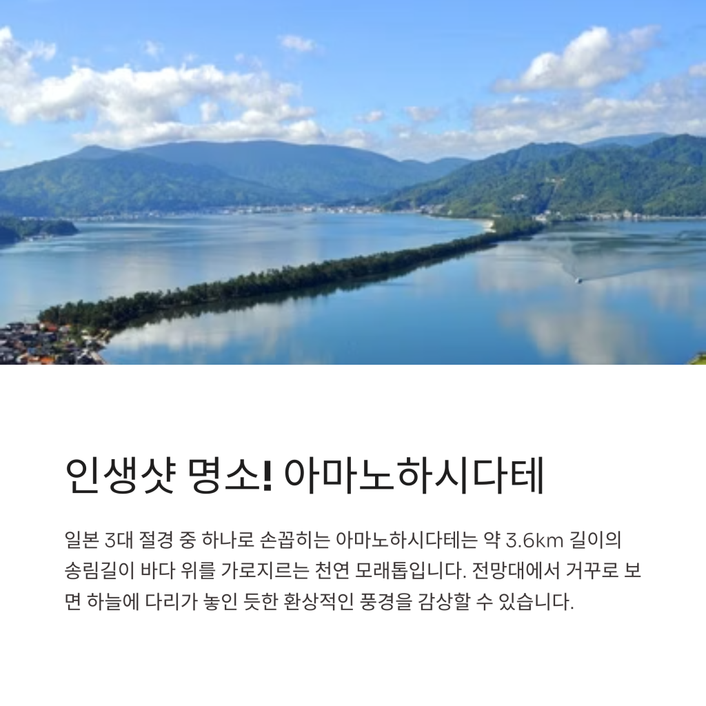 일본 3대 절경 중 하나로 손꼽히는 아마노하시다테는 약 3.6km 길이의 송림길이 바다 위를 가로지르는 천연 모래톱입니다. 전망대에서 거꾸로 보면 하늘에 다리가 놓인 듯한 환상적인 풍경을 감상할 수 있습니다.