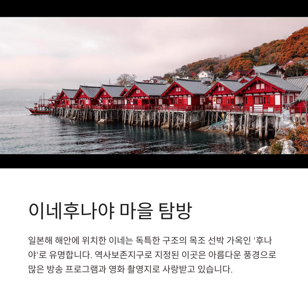 일본해 해안에 위치한 이네는 독특한 구조의 목조 선박 가옥인 ‘후나야’로 유명합니다. 역사보존지구로 지정된 이곳은 아름다운 풍경으로 많은 방송 프로그램과 영화 촬영지로 사랑받고 있습니다.