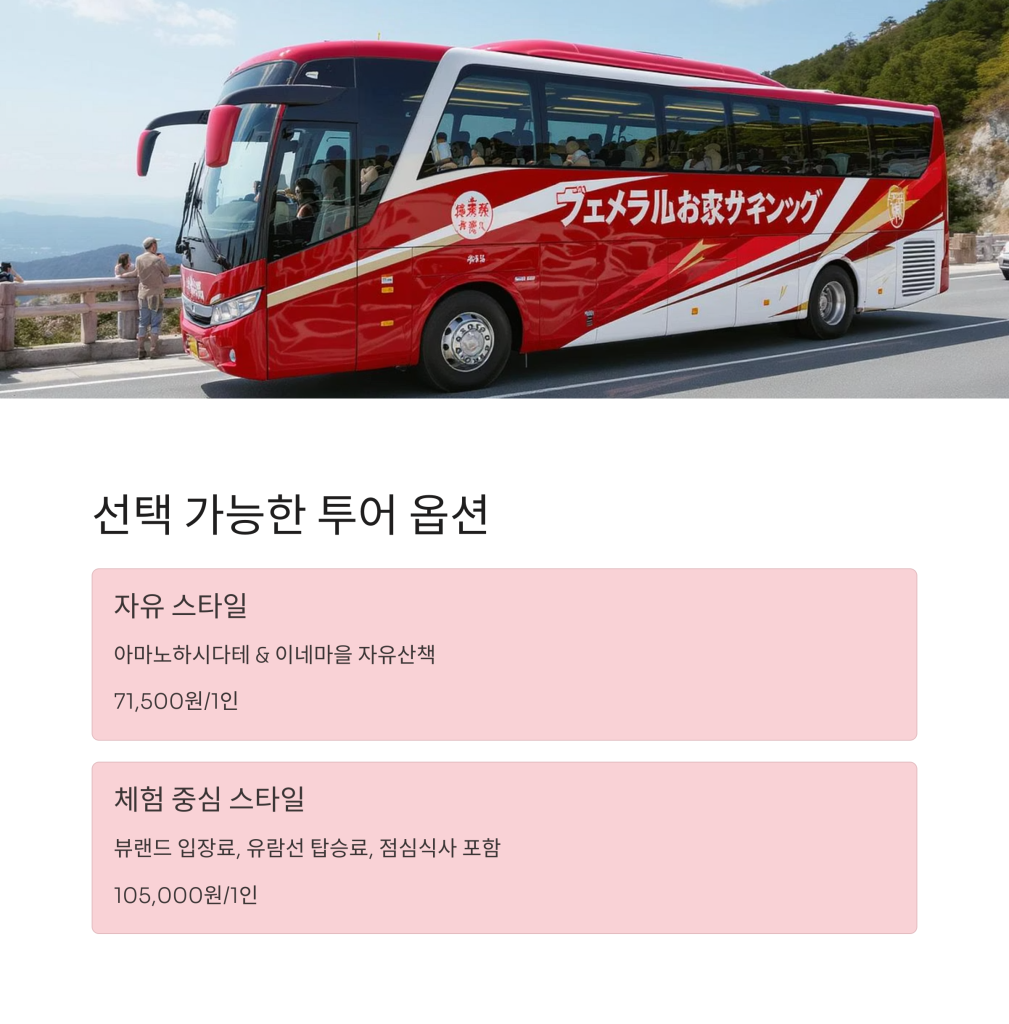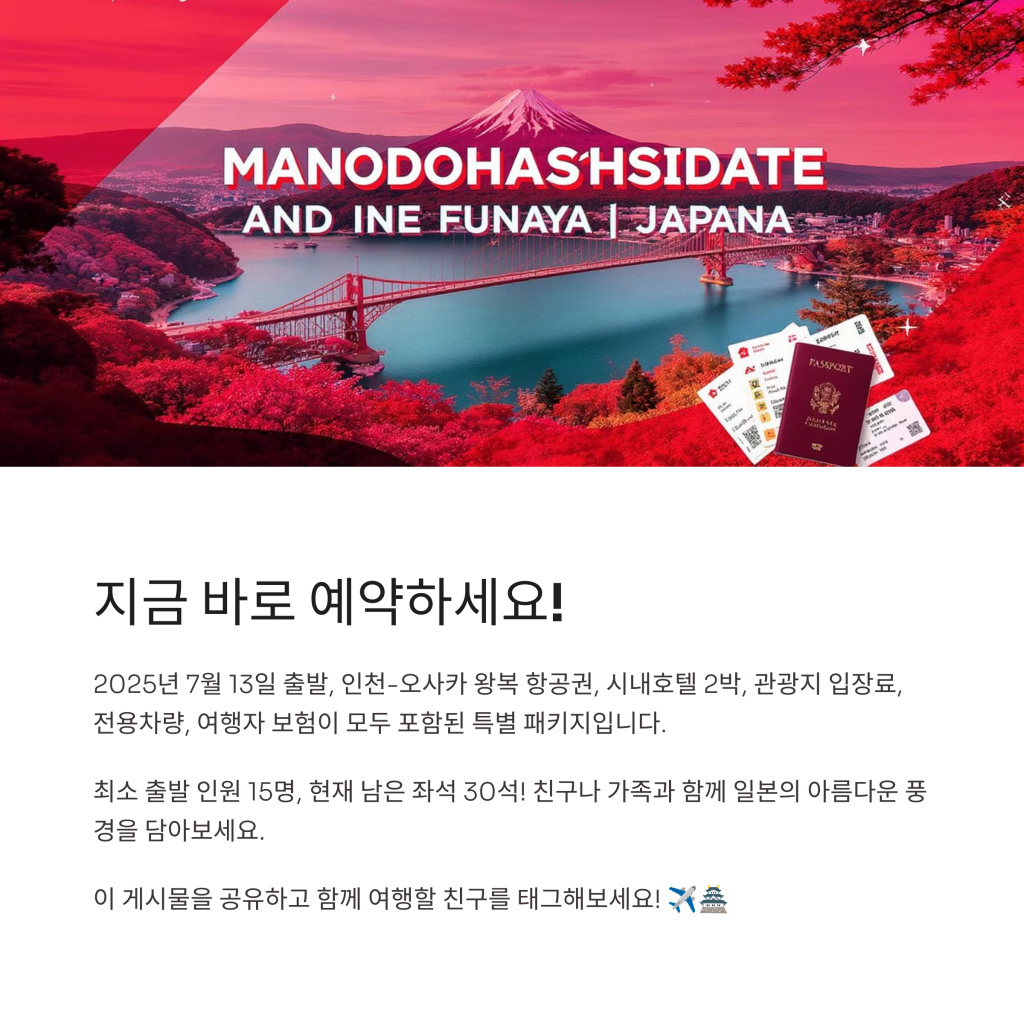 최소 출발 인원 15명, 현재 남은 좌석 30석! 친구나 가족과 함께 일본의 아름다운 풍경을 담아보세요.