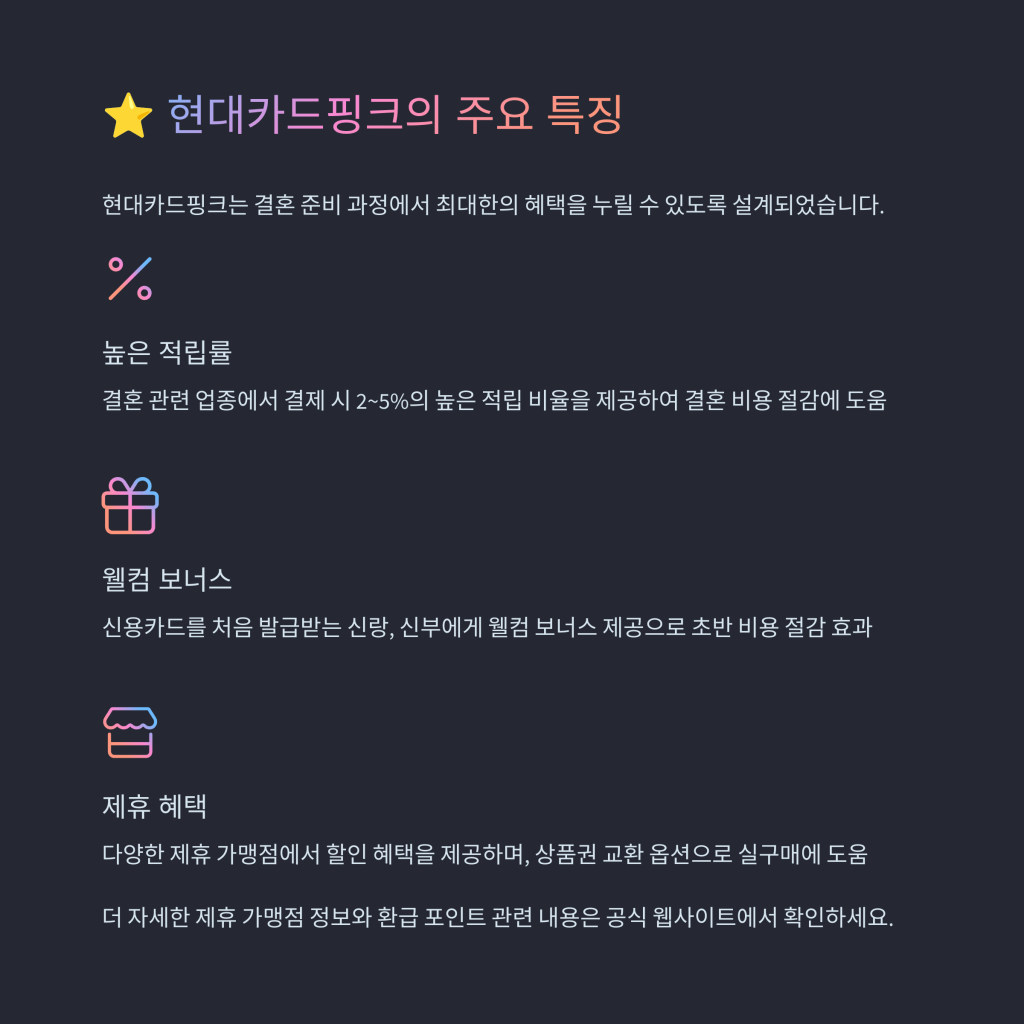 현대카드핑크는 다양한 혜택을 통해 결혼 준비 과정에서의 경제적 부담을 줄일 수 있습니다. 우선, 결혼 관련 업종에서 사용 시 높은 포인트 적립률이 가장 큰 장점입니다.
