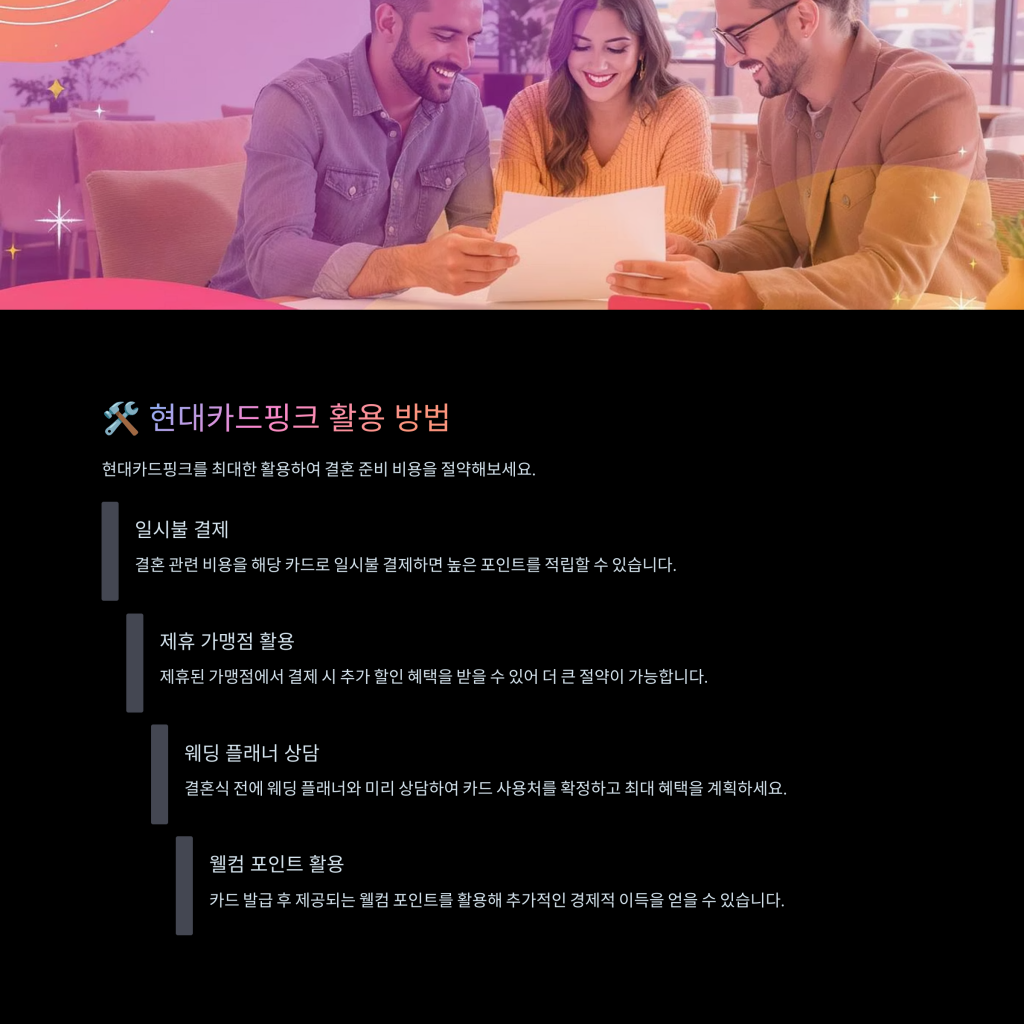 둘째, 신용카드를 처음 발급받는 신랑, 신부에게는 웰컴 보너스가 주어져 초반 비용 절감 효과가 있습니다. 셋째, 현대카드핑크는 다양한 제휴 가맹점에서 할인 혜택을 제공하며, 결혼 관련 업체에서 자주 사용하는 카드입니다.