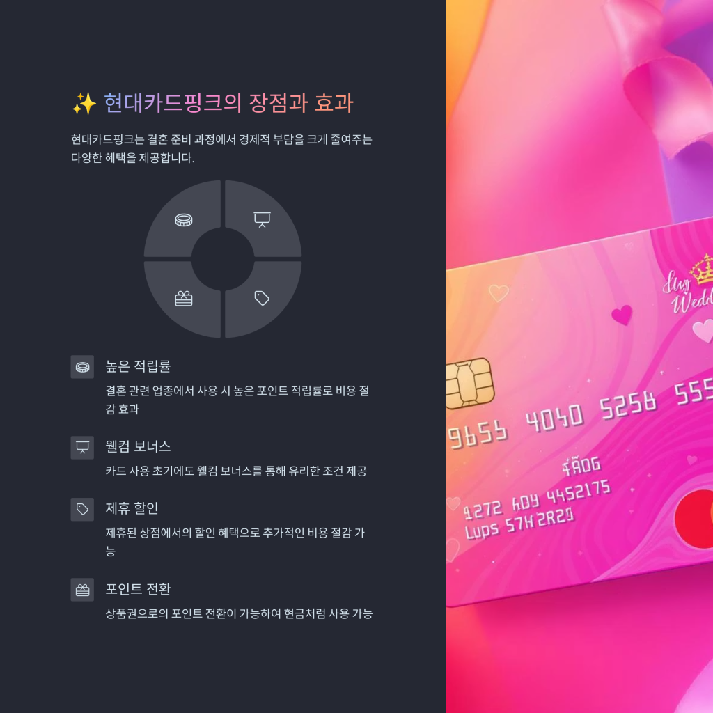 현대카드핑크는 높은 포인트 적립률과 결제 시 추가 혜택을 제공하며, 결혼식 비용을 부담스러움 없이 관리할 수 있도록 돕습니다.