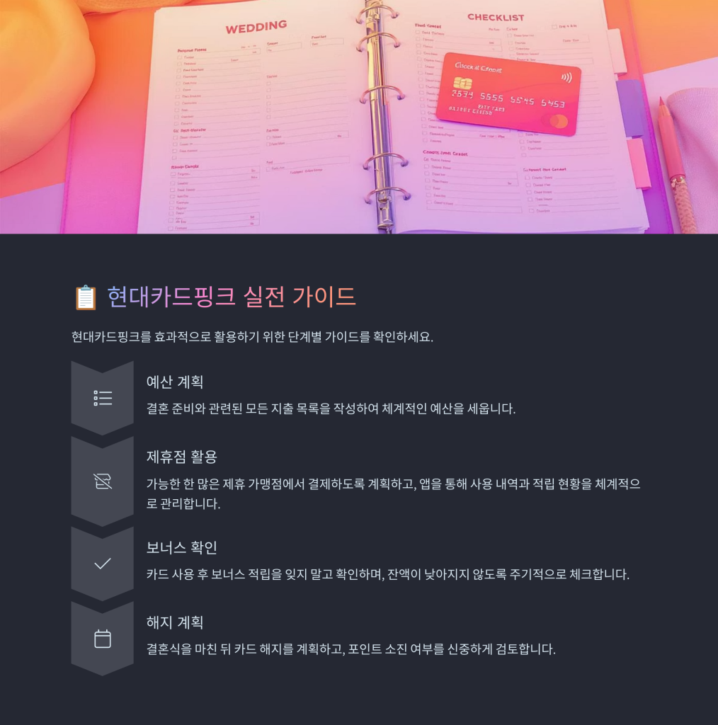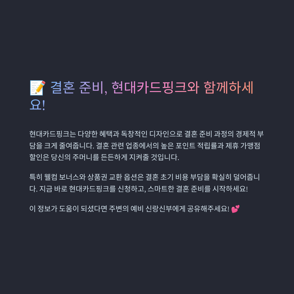 현대카드핑크는 결혼 관련 지출 시 높은 포인트 적립과 다양한 혜택을 제공합니다. 특히 결혼 준비를 위한 카드로 최적화되어 있어 비용 절감에 도움이 됩니다.